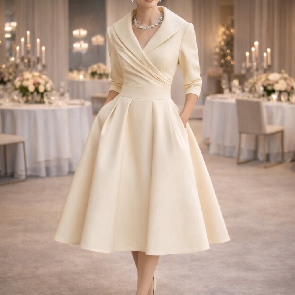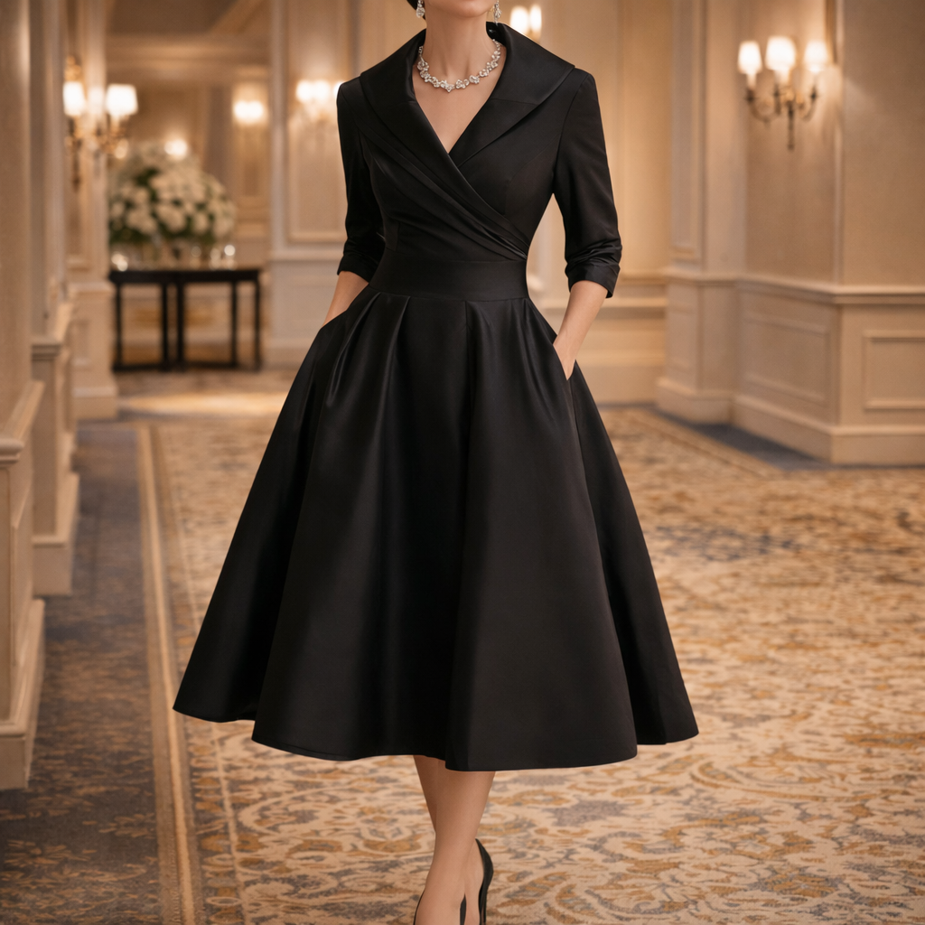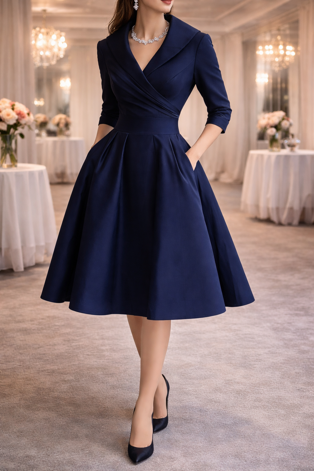 This dress features a feminine V-neckline with a softly wrapped bodice and elegant midi length. The structured waist enhances your shape, while the flared skirt adds movement and charm. Designed with 3/4 sleeves and subtle side pockets, it offers a timeless silhouette that suits both relaxed and dressed-up occasions.