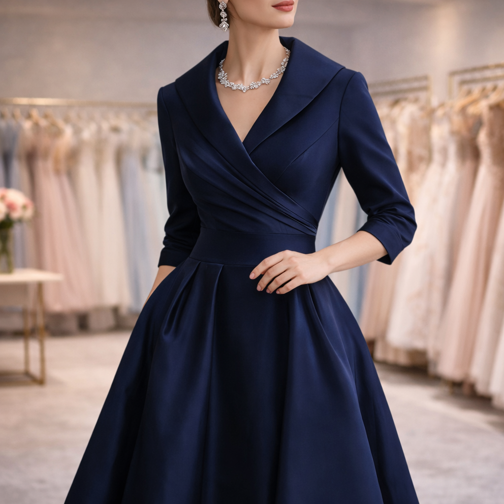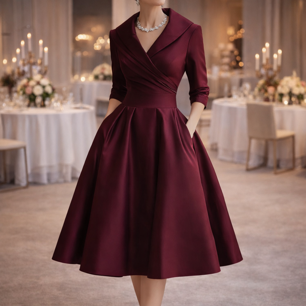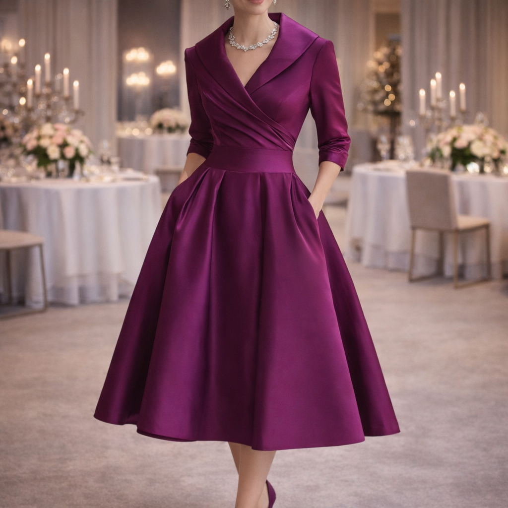 This dress features a feminine V-neckline with a softly wrapped bodice and elegant midi length. The structured waist enhances your shape, while the flared skirt adds movement and charm. Designed with 3/4 sleeves and subtle side pockets, it offers a timeless silhouette that suits both relaxed and dressed-up occasions.